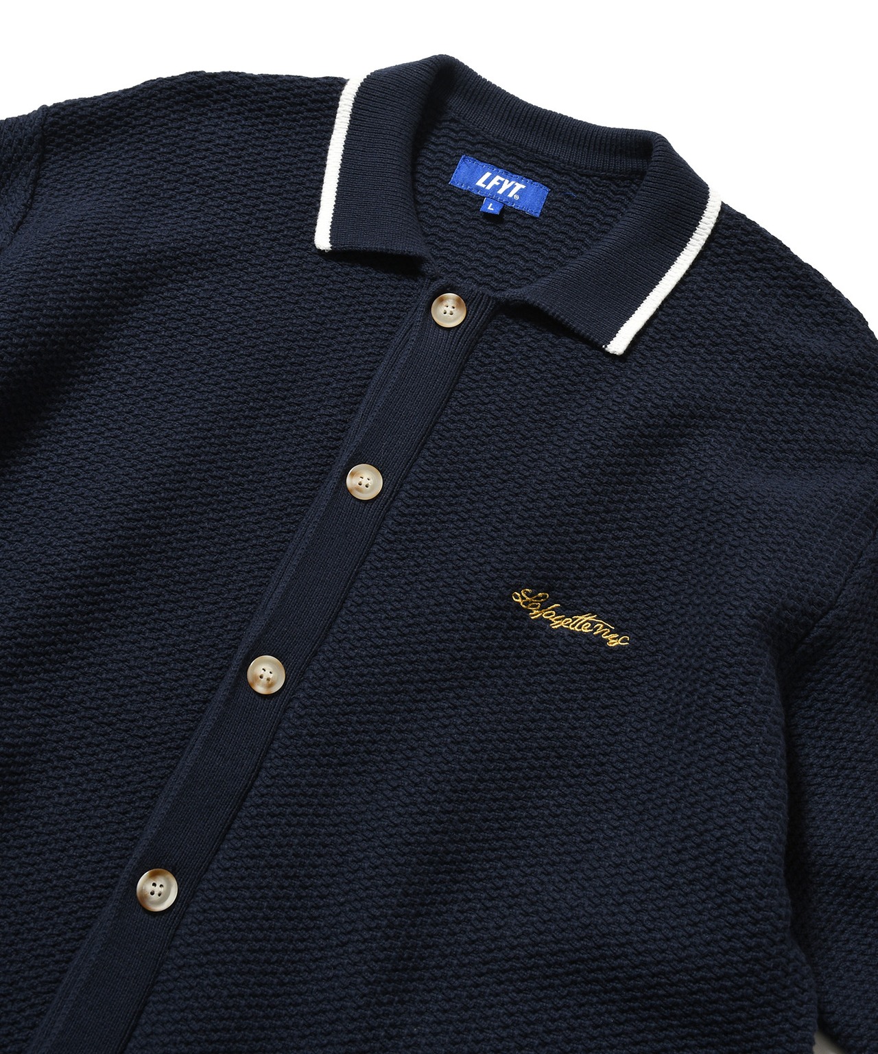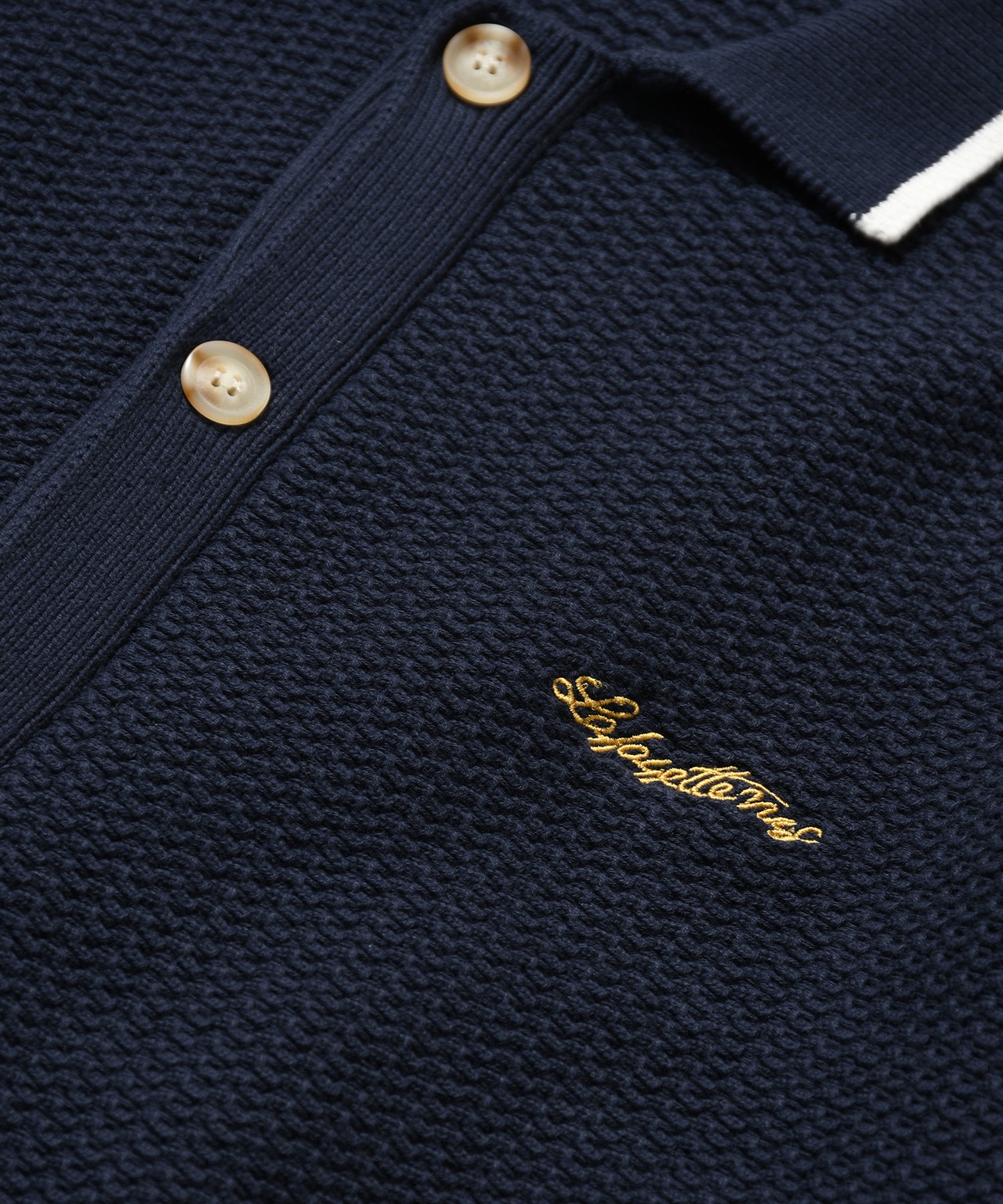 胸元には筆記体調の「Lafayette NYC」ロゴ刺繍を配置。