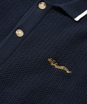 襟付きのボタン仕様に加え、袖口と裾はリブで仕上げた上品なデザイン。